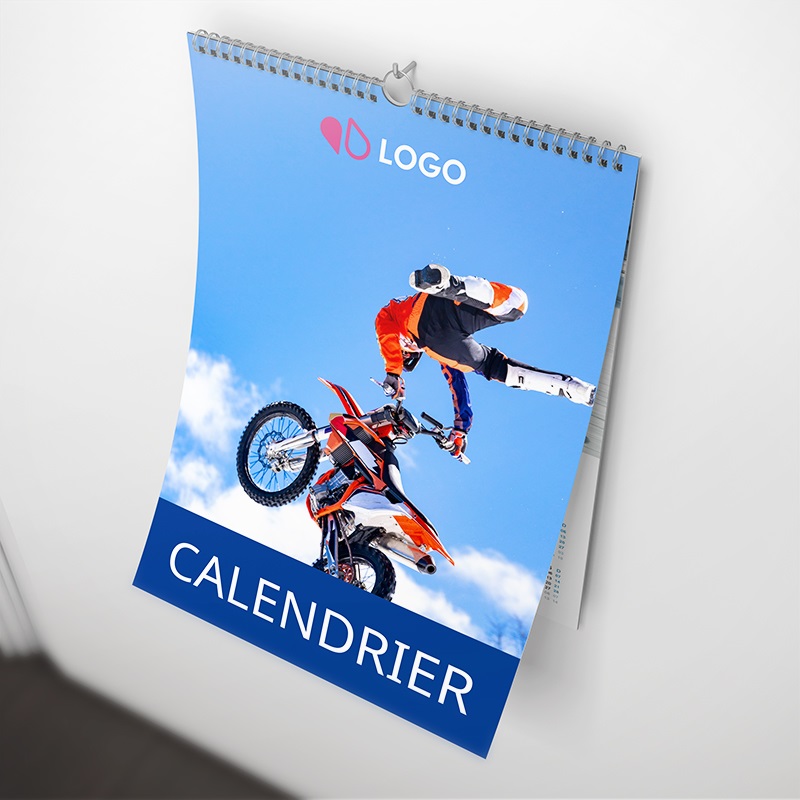 Le calendrier spirale personnalisé aux couleurs de votre marque, avec des photos de vos produits ou simplement avec un message, est idéal pour orner les murs et rester dans l’esprit de vos clients toute l’année !